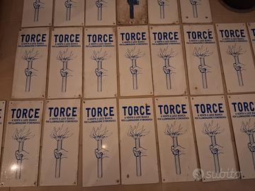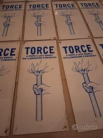 Cartello d'epoca " torce a vento a luce bianca per illuminazione d'emergenza ", in lamiera, misura 15 x 35, prezzo 10 euro cadauno. Cartello, targa, tabella, insegna, vintage, industrial design.