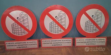 Cartello d'epoca " È vietato arrampicarsi su scaffali, contenitori sovrapposti o cataste di materiale ", in lamiera, misura 40 x 52,5 cm. Prezzo euro 40 cadauno. targa, tabella, insegna, vintage, industrial design