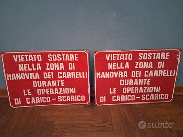 Cartello d'epoca " vietato sostare nella zona di manovra dei carrelli durante le operazioni di carico-scarico, in lamiera, misura 33 x 47 cm. Prezzo euro 15 cadauno. targa, tabella, insegna, vintage, industrial design
