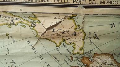 strappata attaccata sotto in orizzontale.Due riparazioni fatte male ai due lati, a 1/3 dalla base, vedi foto.La cartina misura in orizzontale 107 cm, in altezza 90 cm,ha due stecche di legno verniciate a 1/2 giro che la rendono appendibile e tesa per gravità.Realizzazione a cura dell'Officina Cartografica Paolo Longhi & C. di Bergamo.