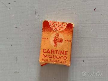 Antico mazzo di carte antiche da gioco in confezione originale. Sono dedicate ai bambini e misurano 3, 2 cm x 4,3. Marca Gallo. Si tratta di un articolo da collezione e la scatola contiene il mazzo completo.