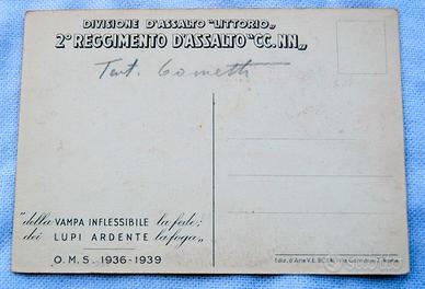 Rarissima ed affascinante cartolina commemorativa italiana – non viaggiata - del 2° REGGIMENTO D’ASSALTO “CC.NN.” DELLA DIVISIONE “LITTORIO” che ha combattuto “eroicamente” al fianco delle truppe nazionaliste del generale Francisco Franco, per liberare la Spagna dal comunismo. Il cimelio cartaceo in argomento è stato edito nel 1940 dalla ditta “V. E. BOERI – ROMA” che, altresì, ha coniato anche la “medaglia commemorativa” di cui dispongo e che, per questioni di opportunità, cedo separatamente (vedasi giusta sezione “DECORAZIONI” del sito). La cartolina in argomento ritrae un bellissimo "bozzetto" dove è disegnata una freccia “giallo-rossa” (con i colori di “Roma”) con su scritto “2° REGG.NTO D’ASSALTO CC.NN.” con sfondo la Spagna, che colpisce diritta Barcellona e poi di rimbalzo da un lato Gerona e dall’altro Madrid nonché Alicante. Dietro la freccia un pugno di un cavaliere rivestito dall’armatura, che stringe tra la mano cinque stendardi con i drappi di “ARDENTE” – “INFLESSIBILE” – “LUPI” – “VAMPA” – “2° REGGIMENTO DIVISIONE D’ASSALTO LITTORIO”. I primi quattro sono i nomi delle quattro Compagnie che componevano il 2° Reggimento. In alto insegne legionarie romane, mentre sul suolo iberico una moltitudine di cannoni e lame. Al verso, oltre all’intestazione del predetto Reggimento, reca scritto in basso a sinistra della “VAMPA” e “INFLESSIBILE” la fede – dei “LUPI” e “ARDENTE” la foga. “O.M.S. 1936 -1939”. Reca altresì una scritta in lapis, probabilmente coeva della “Camicia Nera” alla sua amorosa, che recita “tanti bacetti”. Stupenda FONTE MATERIALE” storica cartacea dell’epoca, che risulta catalogata con “giusta” quotazione di mercato a pag. 75 del testo “MVSN IN PACE E IN GUERRA” a firma di Furio Arrasich e Luigi Di Biase. La cartolina è conservata in "OTTIME" condizioni, senza difetti e/o mancanza alcuna. Misure: 150 mm x 105 mm.