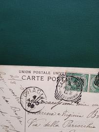 Bellissima cartolina d’epoca giapponese, risalente ai primi del Novecento, con fotografia di due bambine in abiti tradizionali, finemente colorata a mano. La cartolina è viaggiata, con timbro postale datato 1906 da Alessandria (Italia) e francobolli del Regno d’Italia da 5 centesimi.