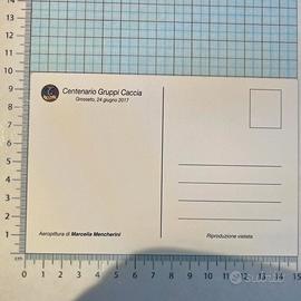 Cartolina celebrativa del Centenario Gruppi Caccia in Italia. L'immagine raffigura aerei in volo in un contesto artistico e astratto.