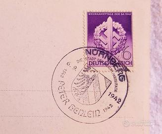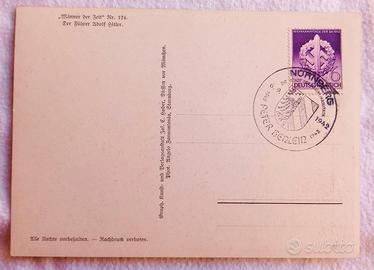 Rarissima cartolina fotografica d’epoca nazista che ritrae il “FÜHRER” Adolf Hitler di profilo in primo piano, in uniforme. L’affascinante cartolina, al verso, reca un bellissimo francobollo delle “SA” ed “annullo postale” delle poste di Norimberga avvenuto mediante timbro “coevo” il 6 settembre 1942. Il cimelio cartaceo in argomento si presenta in "ECCELLENTI " condizioni di conservazione, senza mancanza, rottura e/o difetto alcuno. Misure: 150 mm x 106 mm.