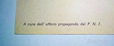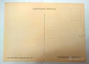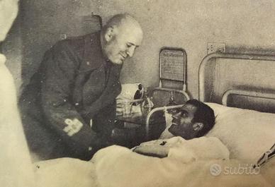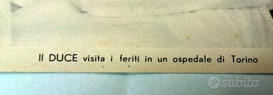 Interessante cartolina d'epoca fascista "NON VIAGGIATA", emessa a cura dell'Ufficio Propaganda del P.N.F. (Partito Nazionale Fascista) e stampata da S.A. Poligrafici "IL RESTO DEL CARLINO" di Bologna. Il bellissimo cimelio cartaceo reca sul dritto una foto del DUCE Benito Mussolini del 1942, mentre si reca in visita a trovare i feriti in un Ospedale di Torino, scattata mentre saluta affettuosamente un soldato allettato. La cartolina si presenta in "ECCELLENTI" condizioni di conservazione come da foto, senza mancanze, strappi e/o difetto alcuno. Misure: 148 mm x 105 mm.