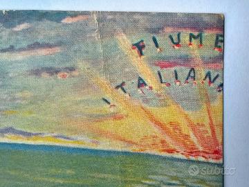 Rarissima cartolina d'epoca "primo fascismo" cosiddetto "squadrista" anni '20 di propaganda nazionale "FIUME ITALIANA" - Non Viaggiata. La stessa ritrae in un bellissimo "bozzetto" una famiglia italiana composta dalla madre abbracciata ai suoi due figli, che osservano dal suolo istriano (all'epoca territorio italiano) l'Impresa di Fiume che divenne anch'essa annessa al Regno d'Italia (1919 - 1920), al di là del mare del Golfo del Quarnaro (o Quarnero). Il "prezioso" cimelio cartaceo in argomento, privo di indicazioni sul retro, è espressione "viva" del sentimento nazionalista italiano in quegli anni. La cartolina è conservata in "OTTIME" condizioni, senza difetti e/o mancanza alcuna, con qualche piega inevitabile, visto il tempo trascorso. Misure: 140 mm x 90 mm.