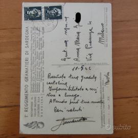 "Cartolina Militare 1942 - 1° Reggimento Granatieri di Sardegna - Ed. Boeri" Cartolina militare italiana d'epoca molto interessante, risalente al periodo della Seconda Guerra Mondiale. Rappresenta il 1° Reggimento "Granatieri di Sardegna", l'unità più antica dell'Esercito Italiano. Descrizione dell'Oggetto Soggetto: Cartolina celebrativa del 1° Reggimento Granatieri di Sardegna. Iconografia: L'illustrazione mostra tre granatieri in uniforme grigio-verde con l'elmetto M33 e il classico fregio a fiamma. Sullo sfondo campeggia il motto del reggimento: "A me le guardie per l'onore di Casa Savoia". Si nota una grafica di stampo futurista/razionalista tipica degli anni '30/'40, con un'aquila stilizzata e il tricolore. Periodo: 1942 (deducibile dal timbro postale e dalla dicitura dell'Era Fascista "XX" in basso a destra sul retro). Dettagli Tecnici: * Viaggiata: Sì, presenta due francobolli e timbro postale. Edizione: Ediz. d'Arte V.E. BOERI - Roma (una casa editrice molto nota tra i collezionisti di militaria). Condizioni: Buone, con lievi segni del tempo sui bordi coerenti con l'età. Il retro contiene un messaggio manoscritto datato 10 maggio 1942.