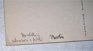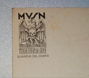 Estremamente rara ed affascinante cartolina d’epoca fascista – non viaggiata – dei “MOSCHETTIERI DEL DUCE – GUARDIA DEL CORPO”. Lo strepitoso cimelio cartaceo in argomento è stato edito durante gli anni ‘30 da “Edizioni d’Arte V. E. BOERI – Via Corridoni, 7 - Roma” ed il bozzetto disegnato dal celebre illustratore Clemente Tafuri. Al dritto raffigura disegnati un “manipolo” di moschettieri del Duce che sfilano in uniforme elmati con il loro pugnale modello ‘35 rivolto verso l’alto, mentre al verso in alto a sinistra è presente il loro logo costituito dalla dicitura “MVSN “(da dove venivano selezionati), l’aquila con il teschio al centro con due sciabole incrociate (il loro simbolo) che poggia su un fascio posto in orizzontale e sotto la dicitura “MOSCHETTIERI DEL DUCE – GUARDIA DEL CORPO”. In basso sempre a sinistra è presente il motto attribuitogli da Mussolini riprodotto con la sua grafia ovvero “MOSCHETTIERI SILENZIOSI E FEDELI – MUSSOLINI”, in basso a destra la dicitura “Ediz. d’Arte V. E. BOERI – Via Corridoni, 7 - Roma” e, infine, al centro, la dicitura “Da pittura di C. TAFURI – Riproduzione vietata”. Stupenda FONTE MATERIALE” storica cartacea del Ventennio fascista, che risulta catalogata con quotazione di mercato “attualizzata” al 2004 (circa 20 anni fa) già allora di ben 300 euro, a pag. 37 del testo “MVSN IN PACE E IN GUERRA” a firma di Furio Arrasich e Luigi Di Biase. La cartolina è conservata in "ECCELLENTI" condizioni, senza difetti e/o mancanza alcuna. Misure: 148 mm x 103 mm.