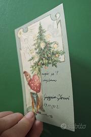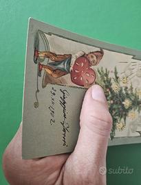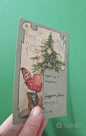 Vendo cartolina postale antica dell'inizio del 1900 non viaggiata ma scritta che raffigura uno gnomo che reca un cuore e un albero di natale con candele accese circondato da angeli che fluttuano nel cielo.
