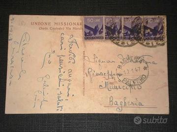 Disponibili altre cartoline da collezione !! Cartolina post card carte postale S. Antonio riprende Ezzelino da Romano per le sue crudeltà Descrizione e caratteristiche: Viaggiata, in bianco e nero e animata. Con 4 francobolli viola da 50 centesimi emessi dalle poste italiane, sul retro. 3 timbri su cui si nota la scritta "Bagheria - Palermo". Spedita il 10/01/1947 e diretta a Bagheria (Sicilia). Dimensioni complessive (busta + cartolina): 13,7 x 8,7 cm. Condizioni: visibilmente vissuta; risente del peso degli anni. Piegata e usurata, con qualche macchiolina marrone. Testo interamente fruibile.