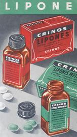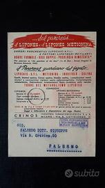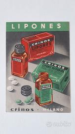 Sponsorizza il farmaco "Lipones" (per il trattamento del pancreas). Descrizione articolo: Laboratori Crinos - Milano. Databile intorno agli anni 50. A colori. Sul fronte immagini del prodotto. Sul retro didascalie sul prodotto e timbri medici. Condizioni: eccezionalmente ben conservata; qualche minima pieghetta/lieve usura lungo i bordi ma nulla di invalidante.
