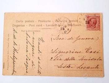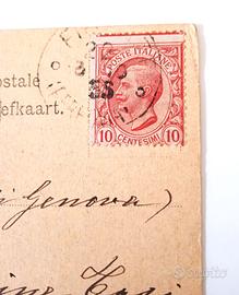 Viaggiata, con timbri di annullo e francobollo da 10 centesimi - emissione del Regno d'Italia, ritrae il profilo del re Vittorio Emanuele III, della serie "Leoni", emesso a partire dal 1906.