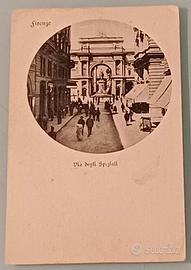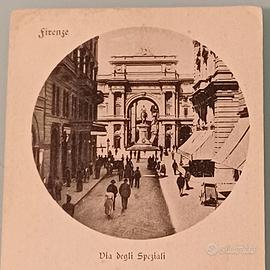 Cartolina storica via degli Spezialiverso la modernaPiazza della Repubblicaa Firenze, come appariva alla fine del XIX . Piazza Vittorio Emanuele II:All'epoca la piazza era dedicata al primo re d'Italia (oggi Piazza della Repubblica). La Statua Equestre:Al centro si vede il monumento aVittorio Emanuele II, realizzato da Emilio Zocchi e inaugurato nel 1890. Questa statua non si trova più qui: nel1932fu rimossa e trasferita in Piazza Vittorio Veneto, all'ingresso delParco delle Cascine, dove si trova tuttora. L'Arcone:Sullo sfondo domina l'arco di trionfo che segna l'ingresso alla piazza, costruito durante il periodo del "Risanamento" che portò alla demolizione dell'antico quartiere del Mercato Vecchio. Via degli Speziali:La strada in primo piano era (ed è) una delle vie d'accesso principali alla piazza. All'epoca ospitava locali storici come lapasticceria Luigi Gillinella sua collocazione originale. Oggi, al posto della statua equestre che vedi nella cartolina, la piazza ospita la celebregiostra anticae laColonna dell'Abbondanza, che segna il centro esatto della città romana. Stato di conservazione: ottimo Pagamento: bonifico, TUTTOSUBITO