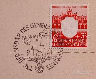 Interessante cartolina d'epoca nazista dedita alla propaganda di guerra. La stessa reca un celebre dipinto stampato dove un soldato del HEER-WEHRMACHT impegnato sul fronte prende sulle spalle un suo camerata commilitone ferito. Nel disegno si notano alcuni particolari “tipici” dei militari tedeschi come l’emblema del Heer sull’elmo e il fucile K98 sul militare in piedi e la baionetta del K98 in versione kombat sulla cintura di quello ferito. In basso la dicitura “NICHT DU BIST DER MAßSTAB! SONDERN DIE FRONT!” ovvero “NON SIETE VOI IL PUNTO DI RIFERIMENTO! È IL FRONTE!” edita dal Governatorato Generale del NSDAP ed in basso a sinistra, la firma dell’artista del dipinto (W.Tschech). Al verso invece reca a sinistra la dicitura “TAG DER NASDAP GENERALGOUVERNMENT 13.-15. AUGUST 1943” ovvero “GIORNO DEL GOVERNATORATO GENERALE DEL NSDAP 13.-15 AGOSTO 1943” e, a destra, il francobollo con annullo postale che avrebbe permesso di fruire liberamente della spedizione ai cittadini che ne sarebbero venuti in possesso, senza pagare le spese di spedizione della stessa. In basso a sinistra reca la dicitura “NACH EINEM GEMÄLDE VON WILL TSCHECH” ovvero “dopo un dipinto di Will Tschech” ed al centro la numerazione “90054/b”, giacché questa cartolina faceva parte di una serie stampate in “edizione limitata” dove la numerazione indica ovviamente il tema scelto. La cartolina si presenta in "ECCELLENTI" condizioni, senza strappo e/o mancanza alcuna. Misure: 148 mm x 105 mm.