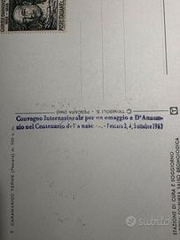 Vendo 3 cartoline commemorative originali del 1963. Le cartoline furono distribuite in occasione del convegno internazionale del 3,4 e 5 ottobre 1963 a Pescara e riportano la dicitura: “..per un omaggio a D’Annunzio nel centenario della nascita...”. Ogni cartolina ha incollato il francobollo d’epoca di lire 30 di Poste Italiane dedicato a D’Annunzio. Le immagini raffigurano tre luoghi simbolici dell’Abruzzo: La casa del Poeta a Pescara (in bianco e nero) La stazione termale di Caramanico Terme La città storica di Penne Condizioni: Cartoline non viaggiate, Ottimo stato di conservazione, Pezzi autentici degli anni ’60 Ideali per collezionisti di cartoline d’epoca, filatelia o memorabilia dannunziana.
