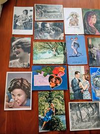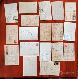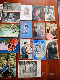 Lotto di 18 cartoline viaggiate, risalenti ai primi decenni del Novecento. Diverse scene e soggetti, la maggior parte donne o fidanzati, alcune in bianco e nero, altre a colori. 5 formato piccolo, una glitterata.