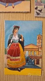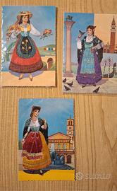 Lotto di 3 cartoline italiane vintage raffiguranti costumi regionali tradizionali femminili con abiti applicati in stoffa in rilievo (souvenir da collezione). Oggetti d’epoca (probabilmente anni ’50–’80 circa), non viaggiati, perfette per collezionisti, decorazione vintage o amanti della cultura popolare italiana. Ancora in apposite bustine di plastica. Tema: costumi regionali italiani. A disposizione:
