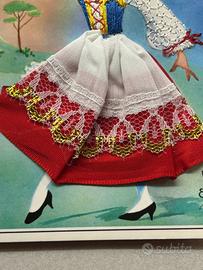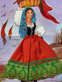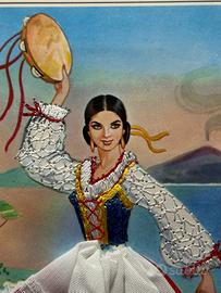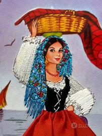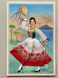 Vendo raro lotto di 2 cartoline d'epoca (anni '50/'60) della celebre serie "Cartoline Vestite". Si tratta di piccoli capolavori di artigianato, dove l'illustrazione viene arricchita con veri tessuti applicati a mano. 1. SARDEGNA:Donna in costume con cesto: Gonna in tessuto rosso e pizzo verde con dettagli dorati. 2. NAPOLI: Danzatrice con tamburello: Iconografia classica con il Vesuvio sullo sfondo, corpetto ricamato blu e bianco. Entrambe firmate dall'artista "Elsi". - NON VIAGGIATE Ideali per collezionisti o per essere incorniciate come decorazione vintage dal sapore tipicamente italiano.