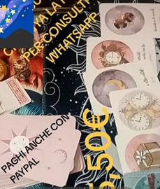 Dal 1993 arte divinatoria .Consulti di cartomanzia professionale ,mediante whatsapp .Tarocchi ,Sibille ,Carte del Cuore ,oracoli , tavola decisionale ,pendolino .Interpreto sogni e comunico 3 numeri fortunati .