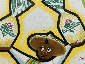 Cartoncino pubblicitario caramelle balsamiche Eucaliptolo Ferrando di Arquata Scrivia, condizioni molto buone come da immagini. Era esposto in negozio ed utilizzato per promuovere la vendita del prodotto. Immagine accattivante, oggetto non comune, anni cinquanta.