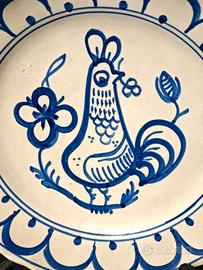 Decorato a mano in monocromia blu su fondo bianco con motivo di un gallo.