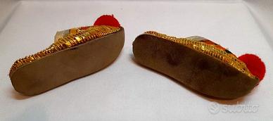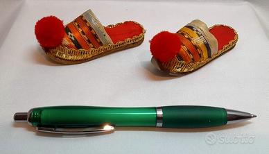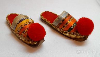 Coppia di deliziose e rare babbucce vintage di stoffa in miniatura, per bambole o da esporre in bacheca.