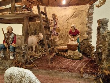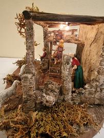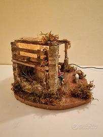 cascina per Presepe con statuine, illuminata molto realistico, fatto a mano, lavorazione in polistirene, legno, polvere cementizia pvc.