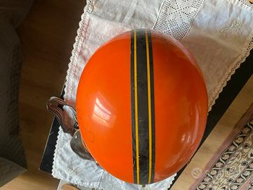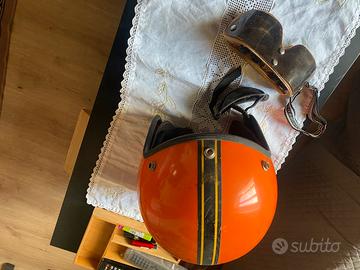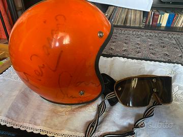 Casco vintage gare auto firmato Arturo Merzario. Calotta esterna in buono stato generale, con segni di utilizzo e patina d'epoca coerenti con l'uso agonistico. Autografo ben leggibile sulla superficie esterna; piccole sfumature dovute all'età e all'uso del casco. Interno con imbottitura originale ingiallita dal tempo — integra nella struttura, autentica nella storia. Occhialoni da corsa in cuoio originali con lenti fumé, cornici in metallo dorato; usura del cuoio coerente con l'epoca. Pezzo venduto nello stato attuale, come da foto. Non certificato da autenticatore terzo; provenienza privata. Un oggetto che non è soltanto un casco: è un frammento dell'epoca d'oro del motorsport italiano. Questo casco open-face color arancione intenso, con le sue iconiche strisce nere e oro sul calottone, porta impressa la firma autografa di Arturo Merzario — l'"Italian Cowboy" che ha scritto pagine indimenticabili nella storia della Formula 1. Chi e’ Arturo Merzario :Pilota Ferrari, Williams, March e fondatore del proprio team, Merzario gareggiò nel Mondiale di F1 dal 1972 al 1979, conquistando 11 punti iridati e diventando leggenda il 1° agosto 1976 al Nürburgring, quando si gettò tra le fiamme per salvare la vita a Niki Lauda. Un gesto che il campione austriaco ricordò sempre come l'atto che gli permise di sopravvivere. Il casco è accompagnato dagli occhialoni da corsa originali in cuoio e vetro fumé — equipaggiamento autentico dell'epoca, quando i piloti affrontavano i circuiti senza visiera integrale.