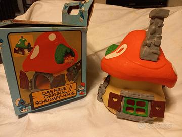 Casetta di Grande Puffo, originale vintage , in vendita. Completa in tutte le sue parti TRANNE una delle due finestrelle a cui manca l'infisso verde e le due antine. Completa di scatola ma SENZA istruzioni. Made in Hong Kong. Anno 1976.