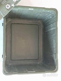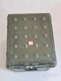 Cassa da Trasporto Militare surplus esercito esercito tedesco in buone condizioni. Struttura molto resistente, in vetroresina con coperchio a chiusura con cerniere in metallo , guarnizione e valvola regolazione pressione. Dimensioni esterne 50x50x60 cm, peso circa 10/15kg. Perfettamente lavata e pronta all'uso.