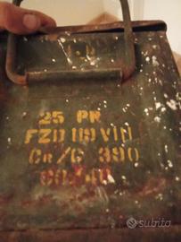 cassa da munizioni inglese, spolette o proiettili da cannone campale da 25libre molto usato per i bombardamenti della zona del cassinate.(25pr sta per pounder, ovvero libbre)prese te anche il codice militare e il numero di lotto. stato di conservazione ottimo, leggibile anche la data, giugno 44. provenienza rilevante, in quanto si tratta del fronte italiano in particolare della battaglia di Montecassino, nelle vicinanze erano accampate le forze armate dell impero britannico.SPECIFICO CHE LE FOTO RISULTANO ESSERE DELLA CASSA APPENA TROVATA E NON PULITA. OVVIAMENTE È STATA PULITA E DIGNITOSAMENTE SISTEMATA SENZA INTACCARE L'ORIGINALITÀ.