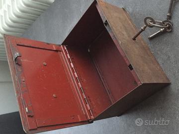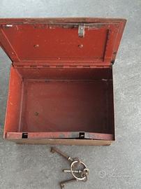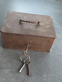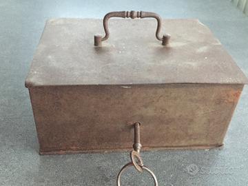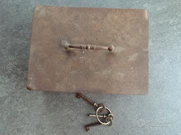 Cassaforte / cassetta di sicurezza antica/vintage con chiave. In metallo (ferro?) pesante circa 2 kg. H 10 cm, lungh 19,50 cm, largh 14 cm Condizioni originali come da foto. Ritiro a mano a Rimini PREZZO RIBASSATO devo traslocare
