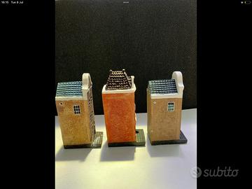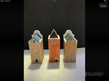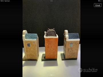 Precioso set de tres miniaturas de casas de los canales de Ámsterdam. Son ideales para decorar una estantería o un escritorio.