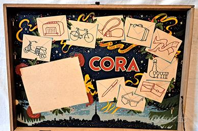 Rara cassetta in legno di liquori Cora anni 70 in stato conservativo molto buono/ottimo, coerente con l’eta’: cerniere, fermaglio di chiusura, catenella interna di fermo coperchio tutti in metallo (tracce d’ossido) perfettamente funzionanti, fori di uscita di antico tarlo trattato con prodotto antitarlo specifico; ottima l’immagine natalizia al coperchio interno ben conservata, personalizzabile dallo spazio vuoto del biglietto