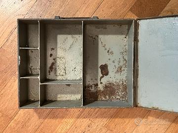Cassetta militare metallo 1 guerra mondiale utilizzata da reparti del Genio (ma non posso documentarlo). Peso 7 kg, dimensioni 36 x 28 x 10. Utilizzata per scopi logistici o per attrezzature specializzate. La finitura grigio/verde oliva presenta una patina di invecchiamento e ruggine superficiale che ne conferma l'autenticità d'epoca. 40€ + spedizione. Visionabile a Milano dove è consegnabile a mano.