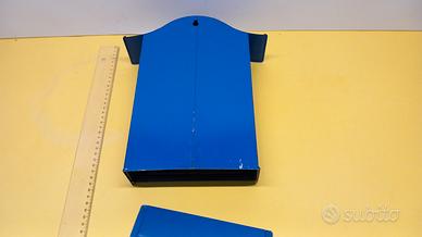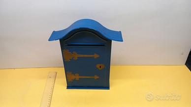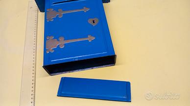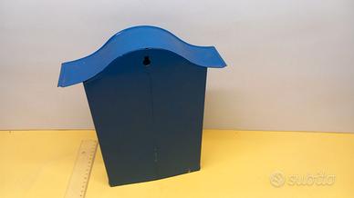 Cassetta per le lettere originale, in lamiera, colore blu e oro, vintage anni '50 '60, inserimento corrispondenza frontale, apertura per prelievo corrispondenza dal fondo con coperchio sfilabile, con poro posteriore per appenderla - altezza 30 cm, larghezza 18 cm, spessore 5,5 cm, larghezza della falda del tetto 25 cm - usata, buono stato - spedizione con imballo ben curato - come da foto - [qw 9938] - euro 10