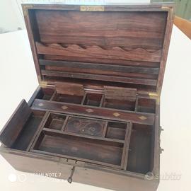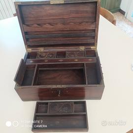 Bellissima cassetta portavalori in palissandro risalente al periodo coloniale vittoriano. Nella parte superiore presenti numerosi scomparti mentre in quella inferiore lo scomparto è unico.