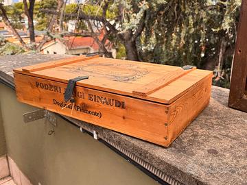 Vendo cassetta originale in legno Poderi Luigi Einaudi (Dogliani – Piemonte) completa di 6 bottiglie d’annata da collezione.