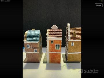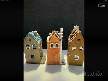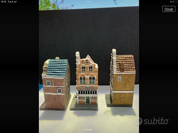 Precioso set de tres miniaturas de casas de los canales de Ámsterdam. Son ideales para decorar una estantería o un escritorio.
