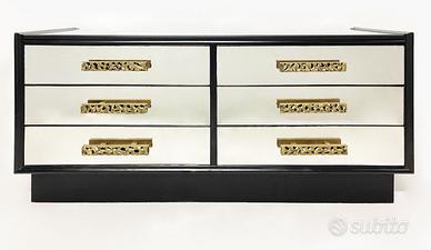 Cassettiera Vintage 1970 con struttura in legno ebanizzato nero, piano e cassetti specchiati e maniglie traforate in ottone.
