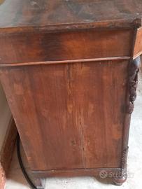 Vendo antica cassettiera con quattro cassetti, piano in legno liscio e angoli in legno lavorato e inciso, misure profondità cm 57, larghezza cm 121, altezza totale cm 121 con piedini