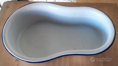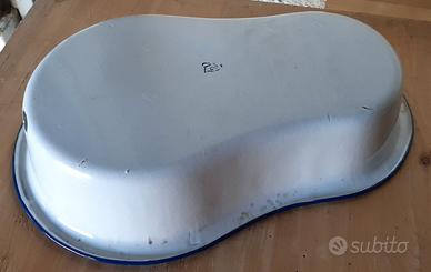 Catino da bidet e brocca in metallo smaltato. Marchiato "Z" come da foto La brocca presenta aree riparate con smalto non originale. Brocca diametro 15 cm, altezza 26 cm Catino 42 x 27 cm