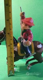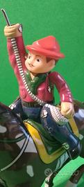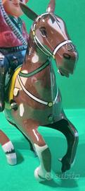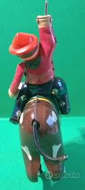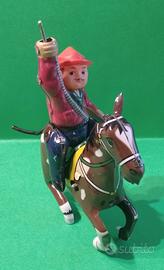 Giocattolo vintage cavaliere in latta a molla, funzionante con chiavetta, manca il lazo, h. cm. 15.