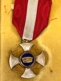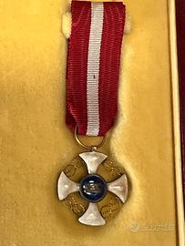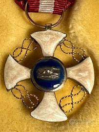 Cavaliere - Ordine della Corona d'Italia L'Ordine della Corona d'Italia era un'onorificenza del Regno d'Italia. Prima onorificenza a carattere "nazionale" del neonato regno italiano, venne istituita nel 1868 da re Vittorio Emanuele II La croce smaltata di bianco presenta i nodi sabaudi d'oro tra i bracci e la Corona Ferrea raffigurata al centro. Veniva conferito a cittadini italiani e stranieri per meriti civili, militari o politici. Materiale: vari con smalti