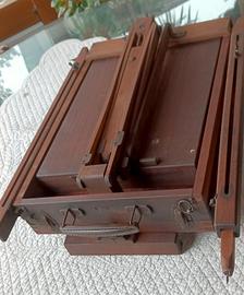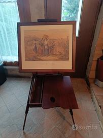 caratteristico cavalletto da pittore francese con tre piedi regolabili . caratteristica dell'impressionismo francese che ha portato la pittura all'aperto " en plein air " . con cassettino porta tempere - colori . asse di pittura e porta quadro verticale estensibile . chiusura a valigetta con maniglia in lamiera di ferro . primi 900 . legno di abete . una gamba ha una prolunga leggermente curva che osta all incastro completo della stessa . preferibile consegna a mano .