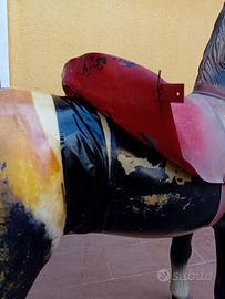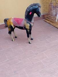 Cavallino anni ’40, ’50, testa in gomma, corpo in plastica dipinta, composto da due parti unite da nastro adesivo non evidente, essendo coperto dalla sella di plastica.