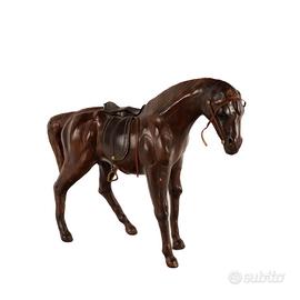 Cavallo in cartapesta rivestito in cuoio con elementi in metallo.