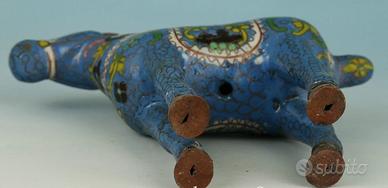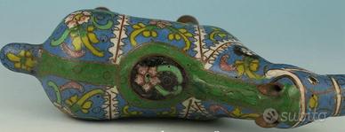 Cavallo vintage in cloisonné cinese - stile Dinastia Tang - blu smaltato" Statuetta di cavallo realizzata con l'antica tecnica del cloisonné (smalto su metallo). Il design si ispira ai cavalli della dinastia Tang, con un vivace corpo blu turchese decorato con motivi floreali a contrasto. Dimensioni: 13,7 x 4,5 x 12,4 cm Peso: 175g Condizioni: Ottime condizioni, smalto integro (controlla le foto per i dettagli della base). Dettaglio tecnico: Presenta il classico foro di sfiato sulla pancia, segno di una lavorazione artigianale autentica."