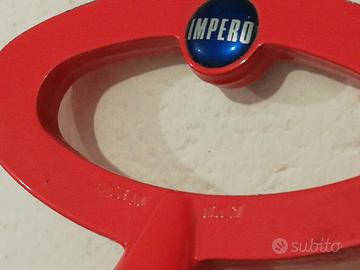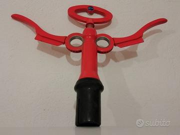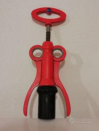 Questo grande cavatappi , modello Impero brevettato dalla BBC Mestre, presenta una struttura in acciaio arancione con una base nera. Più grande del soliti cavatappi, entrò nel mercato negli anni 70'. Prodotto disponibile (condizioni come da foto). Cavatappi in ottime condizioni.